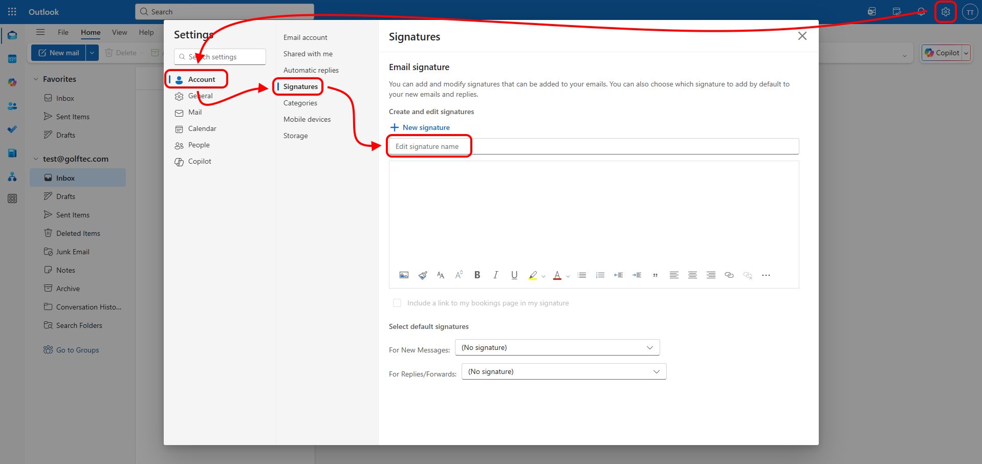 O365 - Outlook.com email signature setup VJ Walbridge Oct 30, 2025 24 1. Open and sign into Outlook.com 2. Click the "Setting gear" in the upper-right hand corner. 3. Then click "Account > Signatures > Edit Signature name"