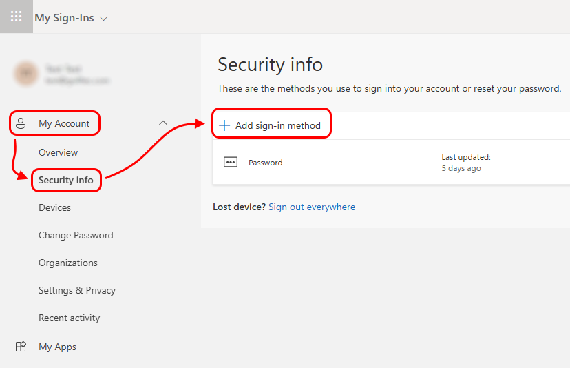 3. Click "My Account > Security info > Add sign-in method"