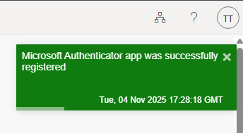 12. A popup notification in the upper-right hand corner of the screen should confirm that you have successfully registered the Microsoft Authenticator app
