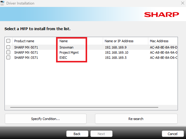 A list of printers will show up. If there are duplicates you can choose either. Select whatever printer(s) you want to add to your computer. Then choose 'next' and then 'next' again on the following screen.
